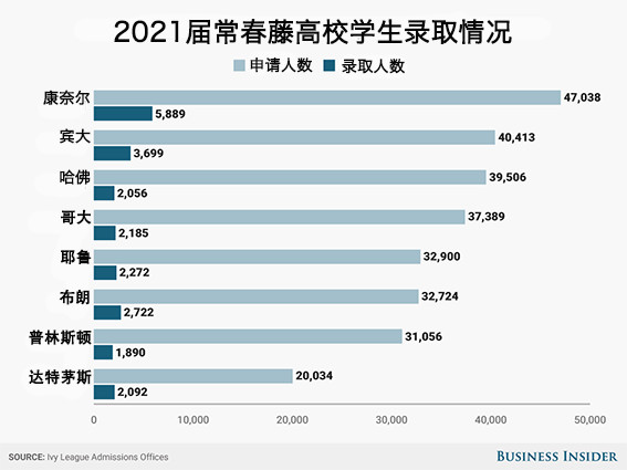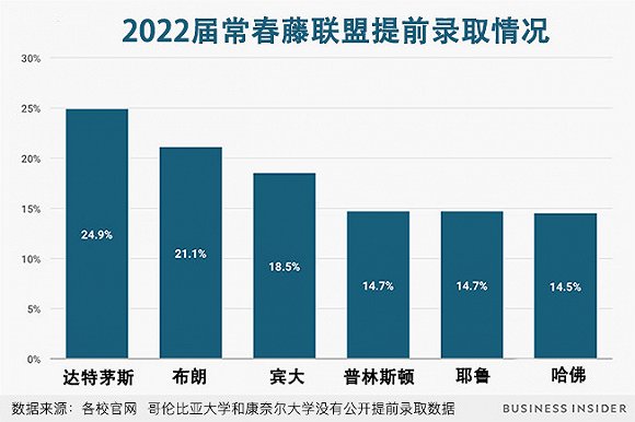 从Business Insider统计的数据图表中可以看出,6所常春藤高校中,提前录取率最高的是达特茅斯学院,而后依次是布朗大学、宾夕法尼亚大学、普林斯顿大学、耶鲁大学和哈佛大学。