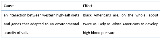 例:Black Americans are, on the whole, about twice as likely as White Americans to develop high blood pressure, This likelihood also holds for westernized Black Africans when compared to White Africans, Researchers have hypothesized that this predisposition in westernized Blacks may reflect an interaction between western high-salt diets and genes that adapted to an environmental scarcity of salt.