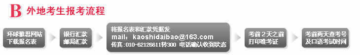 委托代报,可申请各考点各月雅思考试,在http://ielts1.etest.net.cn/cn或考试中心提供的全国雅思考试表上选择考试时间,考生在报名7天之后通过以上网站或查分电话得知报名结果(不主动通知考生),并记住NEEA用户号。新学员报名费用:200元/次(雅思);老学员报名费用:100元/次(雅思)。