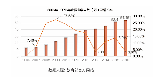 分析:2006年至2016年十年间,中国出国留学人数逐渐上升,在2015年首次突破50万人大关,留学规模持续扩大,预计2017年还将继续增长。