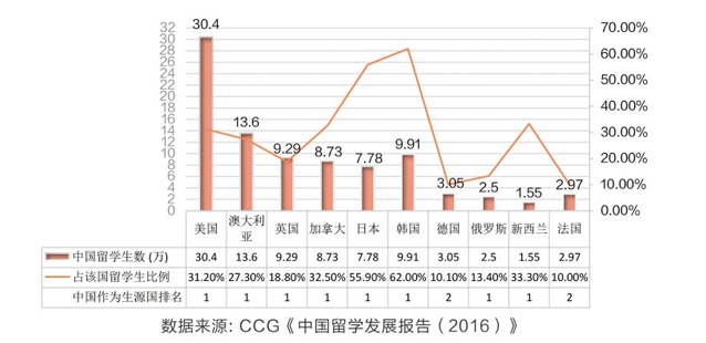 分析:截止2015年,不仅在美国、英国、澳大利亚、加拿大、新西兰等西方国家,在日本、韩国这些亚洲国家,中国已成为最大的留学生生源国。