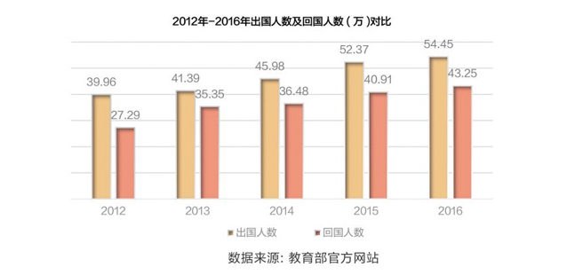 分析:2016年留学回国的人数较2012年增长了15.96万人,较2015年增长了2.34万人。2016年,已有近80%的留学人员选择回国。留学回国人数与出国留学人数之间的差距正在逐渐缩小。