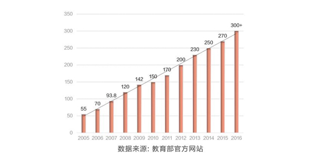 分析:2005年至2015年十年间,考生数量增长了近4倍。2016年考生数量首次突破300万人次。全球已有超过10000所学校,机构和企业等认可雅思成绩,其中包括澳大利亚和英国的所有大学及美国的许多等顶尖院校。