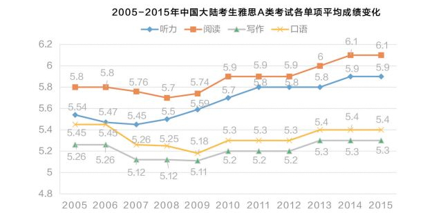 分析:2005-2015年中国大陆雅思A类考试听力和阅读成绩逐渐增长。而口语和写作成绩在2006年至2009年间呈下降趋势,2009年至2015年开始稳步上升,近三年大体保持稳定。