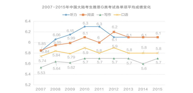 分析:中国大陆考生雅思G类考试四个单项中,阅读听力平均分一直高于口语和写作平均分,其中写作平均分最低,与A类考试情况相似。